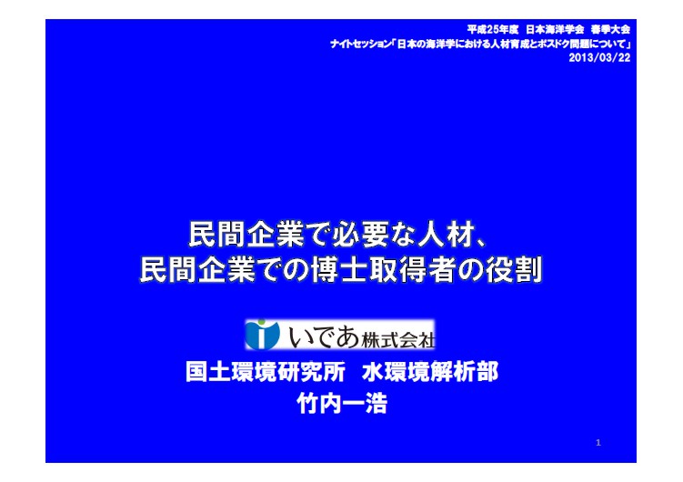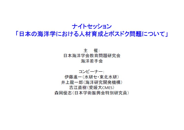 海洋学の推進、教育、そして普及を進めるのは人であり、人材育成は重要な要素である。しかし、近年、博士の学位を取得するために大学院博士課程へ進学する学生数が減少しているようにみえる。その主な原因は、学位取得者のポスドク後の就職先である研究員・大学教員などの研究職が少ないという深刻なポスドク問題にある。実際の大学院博士課程への進学者数の実態を調べるとともに、現在の大学院での教育内容、修了後の就職先等を海外の例と比較し、日本の現状を考察する。これらの情報をもとに、将来の海洋学のため、人材育成・ポスドク問題についての認識を共有し、その具体的な解決策についての意見・情報を交換する場として、本ナイトセッションを企画する。現役の大学院学生、ポスドク研究員の皆さんをはじめ多くの会員の参加を歓迎する。