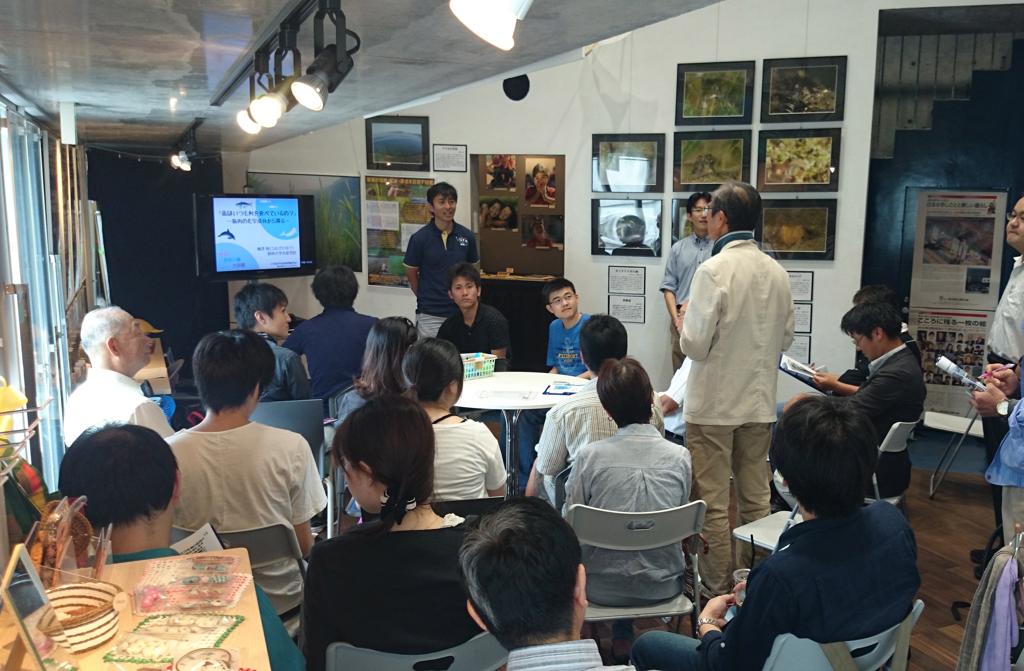 会場となったナガサキピースミュージアムでは、9月2日~28日に「発見、長崎の海大辞展」という長崎近海の海の様子や、海の研究について紹介するイベントを行っており、私は、長崎大水産学部の展示物の取りまとめ役をしていました。そのため、準備段階から、このイベントの展示物と、サイエンスカフェで話す内容がうまく調和するようにイメージしながら行うことが出来たことは、話題提供側としての大きなメリットでした。また、この展示会の様子や、ギャラリートーク(サイエンスカフェ)の開催については、NBC長崎放送や、NIB長崎国際テレビでのニュース、さらに長崎新聞などでも取り上げていただきました。更には、長崎市内の高校を中心に40校程度、近隣の漁協20件程度、市内の公民館や行政関連施設など60件程度にも、チラシを送付しました。しかしながら、当日に集まって頂いた市民の方の中で、メディアや送付したチラシを見て来ていただいた方は1-2名でした。著名人の方の講演会には多くの方が集まるにも関わらず、サイエンスカフェの集客力が低いという実態を変えていくには、宣伝方法だけでなく、サイエンスカフェの実施方法についても、地域の実情に応じた工夫が必要かと思っています。今回、地元で小学生や地域の方を対象として環境教育をされている参加者の方から、別の機会で話題提供することについても声をかけていただきましたので、そのような機会を利用して、サイエンスの普及にも努めていきたいと思っています。