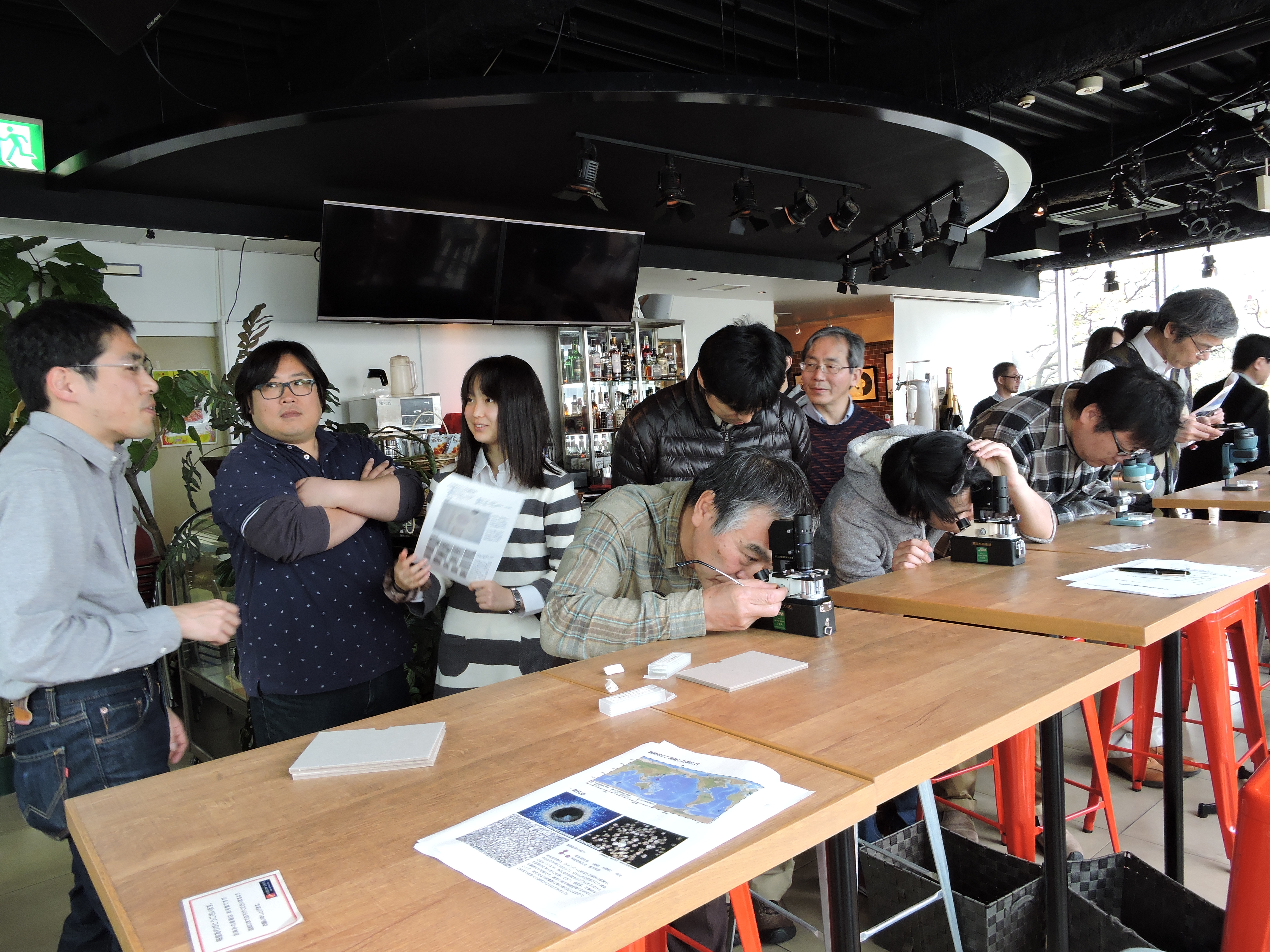 今回 「微化石が語る過去の海」というタイトルでお話をさせていただきました。まず自己紹介で微化石を扱うことになった経緯を簡単に紹介したのち、微化石とは何かというところから解説を始めました。次に微化石の集め方を紹介し、ここで簡単な方法を実践してもらう企画として、航海中に得られた海底堆積物から珪藻化石を簡易的に集める方法の一つを参加者の皆さんに体験していただきました。続いて、海の堆積物において主要な微化石にはどのようなものがあるのか、円石藻、珪藻、有孔虫、放散虫について走査型電子顕微鏡の殻画像を示しながら手短に紹介しました。その後、微化石として先に示した生物群の一部が海底堆積物に保存されるプロセスを説明し、また生物ポンプ効果のように生物活動が環境変動に影響を与えることがあることも示しました。橋濱さんの進行のもと、ここで一度質問コーナーとなり、参加者からの質問に答える形で、海底堆積物を採取する幾つかの方法を解説しました。また、微化石が堆積物に埋没後に受ける続成作用についても質問を頂いたので、生物源オパールを持つ微化石を例に、珪藻などの珪質微化石が堆積層深部で変質して失われてしまう過程があることを説明しました。また、微化石が砂泥層だけでなくチャートなどの岩石に保存されるケースについても触れました。その後、実際に微化石を用いて過去の海洋環境をどのように調べるのか、浮遊性有孔虫群集の生物地理分布を活用した分かりやすい研究例を一つ紹介しました。解説の最後に自分の研究内容を紹介するコーナーとして、珪藻化石群集を用いたベーリング海の過去360万年間の寒冷化傾向を示し、寒冷化による海水準低下を反映したベーリング陸峡形成イベントと陸橋を渡った陸上生物の地理分布との関係について紹介しました。ここまでの解説には約35分かかりましたが、そのあとは店内に並べた実体顕微鏡5台および携帯用生物顕微鏡2台を使って、様々な海域や地質年代から採取された有孔虫化石や珪藻化石を参加者の方に見て 頂きました。フリーディスカッションや質問のコーナーでは、微化石を用いた年代決定法や、微化石の化学分析について、微化石を使った研究の進め方、 湖沼など陸域での微化石研究について、日本とその周辺において微化石が関係する最近のホットトピックは何か?微化石を使った古海洋研究で一番わくわくする瞬間はどんな時か?といった様々な質問を頂きました。また、私の拙い説明内容を咀嚼して分かりやすく再構築してくださる参加者もいて、説明者として助かると同時に、自分の説明の至らなさを認識する機会にもなりました。(小野寺丈尚太郎)