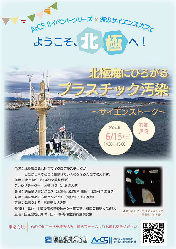 私たちの生活に欠かせないプラスチック。今、世界の海に漂うプラスチックごみが問題になっています。粒の直径が5mm以下のものをマイクロプラスチックと呼びますが、北極海にも大量のマイクロプラスチックが流れ込んでいます。これらのマイクロプラスチックがどこからどのようにして運ばれてきたのか、最終的にどこに溜まっていくのか、まだ分からないことがたくさんあります。このサイエンストークで、研究者と一緒にマイクロプラスチックがどこに運ばれていくのかについて考えてみましょう。