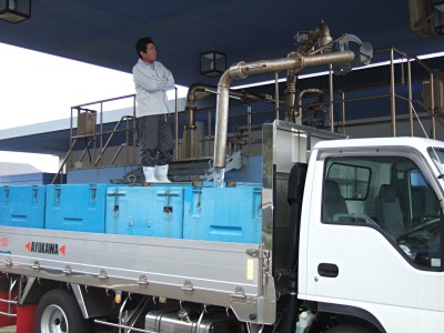 右の写真のトラックは干物作りに利用するために海洋深層水を取りに来たんだ。